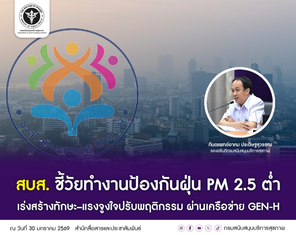 สบส. ชี้วัยทำงานป้องกันฝุ่น PM 2.5 ต่ำ เร่งสร้างทักษะ–แรงจูงใจปรับพฤติกรรม ผ่านเครือข่าย GEN-H 30/01/2026 3:58 PM