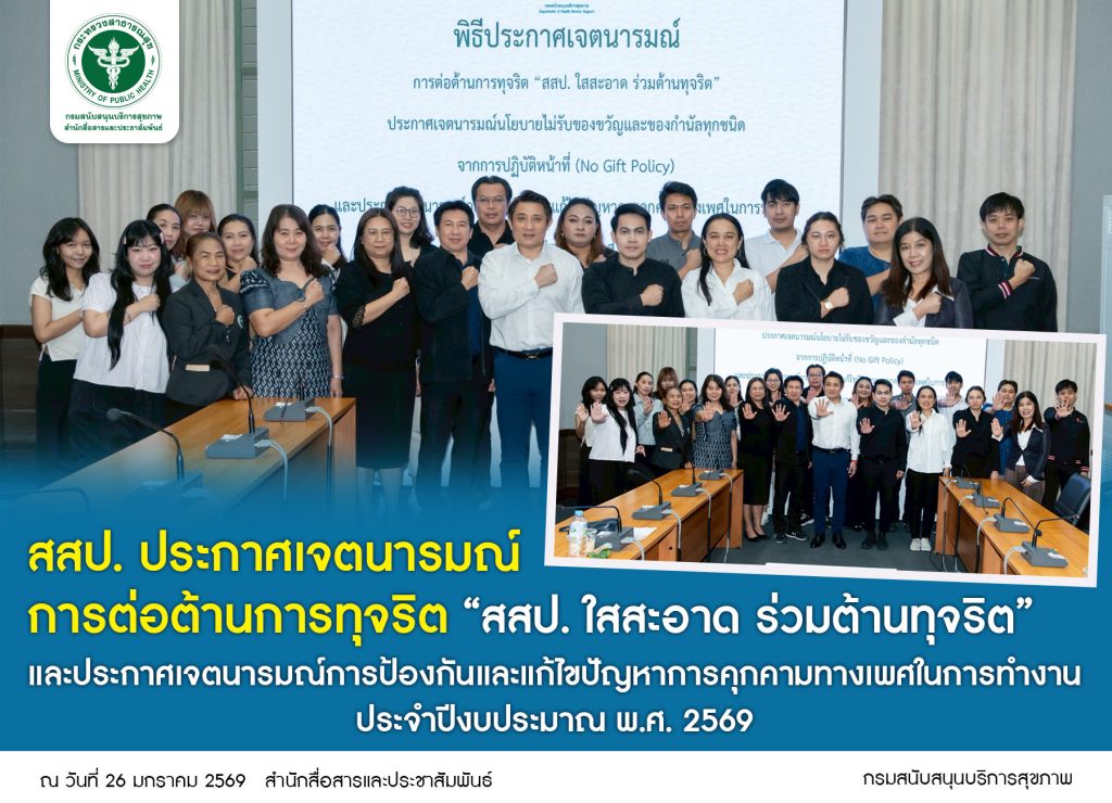 สสป. ประกาศเจตนารมณ์การต่อต้านการทุจริต “สสป.ใสสะอาด ร่วมต้านทุจริต” และประกาศเจตนารมณ์การป้องกันและแก้ไขปัญหาการคุมคามทางเพศในการทำงาน ประจำปี พ.ศ.2569