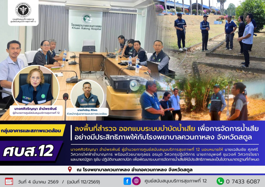ศบส.12 ลงพื้นที่สำรวจ ออกแบบระบบบำบัดน้ำเสีย เพื่อการจัดการน้ำเสียอย่างมีประสิทธิภาพให้กับโรงพยาบาลควนกาหลง จังหวัดสตูล