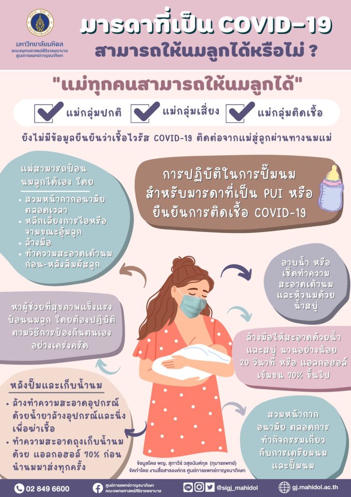 - สนับสนุนการเลี้ยงลูกด้วยนมแม่ โดยแนะนำมารดาที่มีประวัติสัมผัส COVID -19 ความเสี่ยงสูง (PUI) ปั๊มน้ำนมทิ้งจนกว่าจะทราบผลตรวจเป็น Undetectable และ ในมารดาที่ยืนยันการติดเชื้อ COVID-19 ให้ปั๊มนมทิ้ง เป็นระยะเวลา 14 วัน หลังจากนั้นให้นั้นนมแม่แก่ทารกได้ตามปกติ