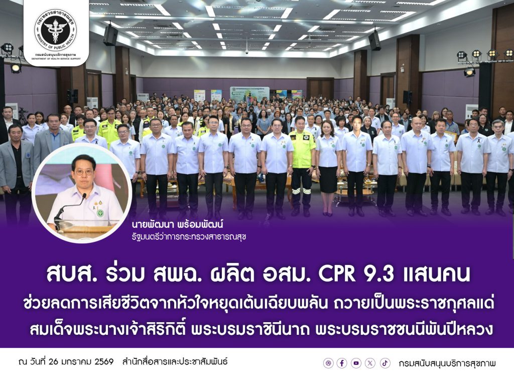 วันนี้ (26 มกราคม 2569) ที่ กรมสนับสนุนบริการสุขภาพ (สบส.) กระทรวงสาธารณสุข จังหวัดนนทบุรี นายพัฒนา พร้อมพัฒน์ รัฐมนตรีว่าการกระทรวงสาธารณสุข พร้อมด้วย นายวรโชติ สุคนธ์ขจร รัฐมนตรีช่วยว่าการกระทรวงสาธารณสุข เปิดกิจกรรม “อสม. และภาคประชาชน เรียนรู้ CPR ช่วยเหลือชีวิตคนไทย ร่วมใจอุทิศถวาย แด่พระบรมราชชนนีพันปีหลวง” โดยมี นายแพทย์เอกชัย เพียรศรีวัชรา นายแพทย์ภานุวัฒน์ ปานเกตุ นายแพทย์วีรวุฒิ อิ่มสำราญ รองปลัดกระทรวงสาธารณสุข นายแพทย์ภูวเดช สุระโคตร อธิบดีกรมสนับสนุนบริการสุขภาพ ดร.พิเชษฐ์ หนองช้าง เลขาธิการสถาบันการแพทย์ฉุกเฉินแห่งชาติ (สพฉ.) ผู้บริหารกระทรวงสาธารณสุข ประธานชมรม อสม. บุคลากรเจ้าหน้าที่สาธารณสุข และ อสม. ร่วมกิจกรรมในรูปแบบ Onsite และ Online จากทั่วประเทศ กว่า 1,500 คน