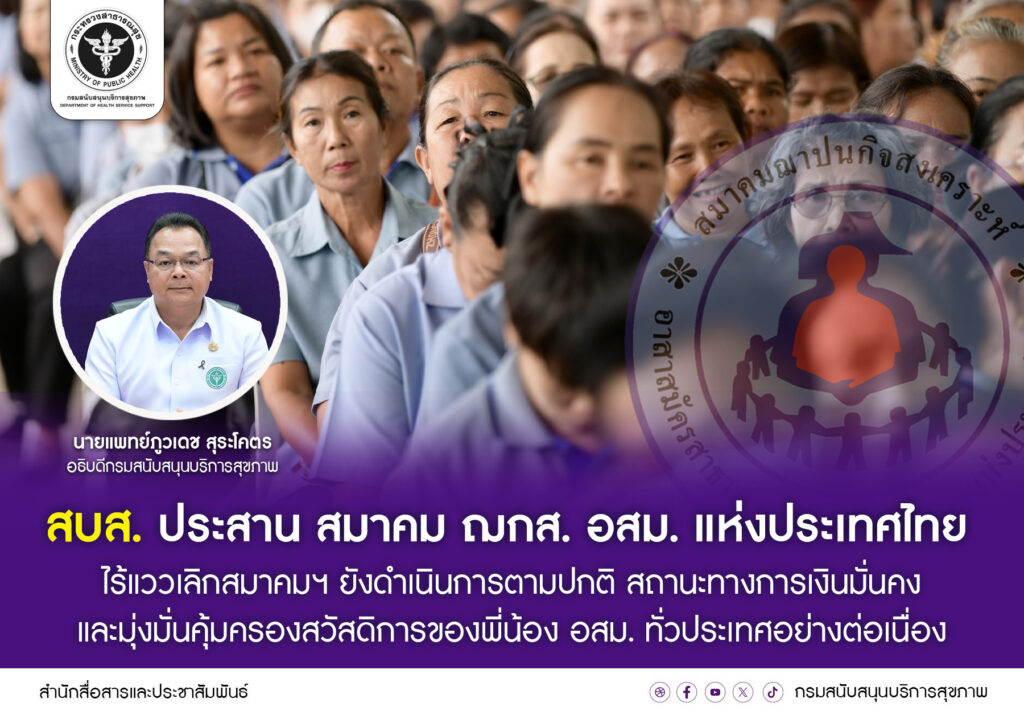 สบส. ประสาน สมาคม ฌกส. อสม. แห่งประเทศไทย ไร้แววเลิกสมาคมฯ ยังดำเนินการตามปกติ สถานะทางการเงินมั่นคง และมุ่งมั่นคุ้มครองสวัสดิการของพี่น้อง อสม. ทั่วประเทศอย่างต่อเนื่อง