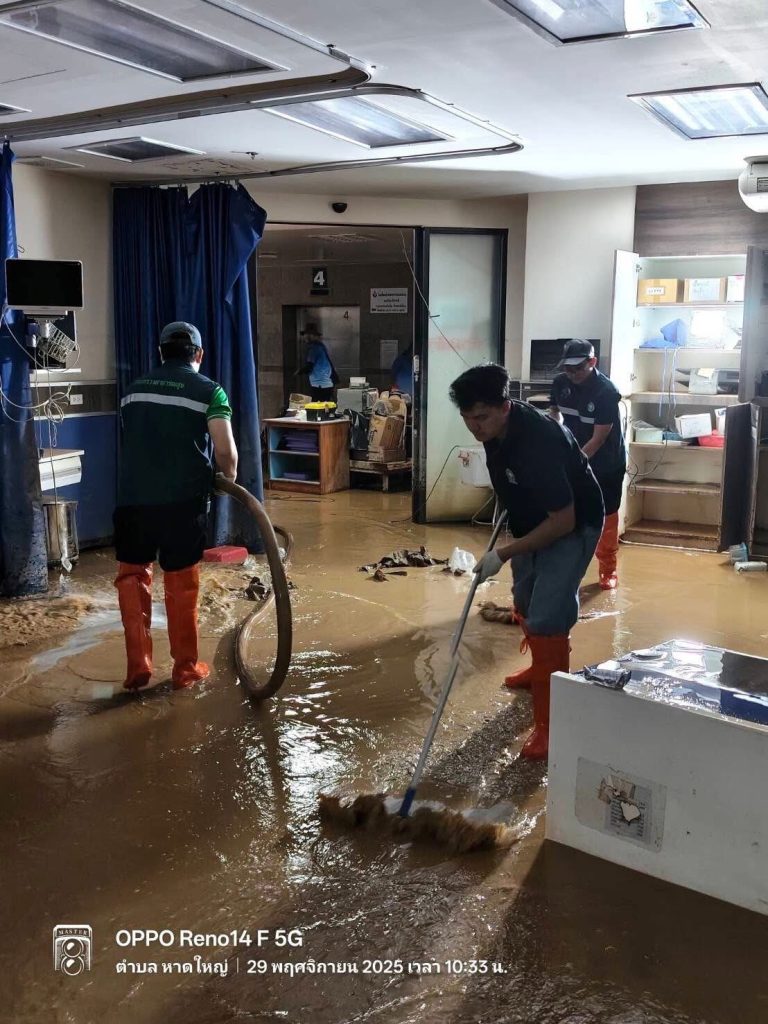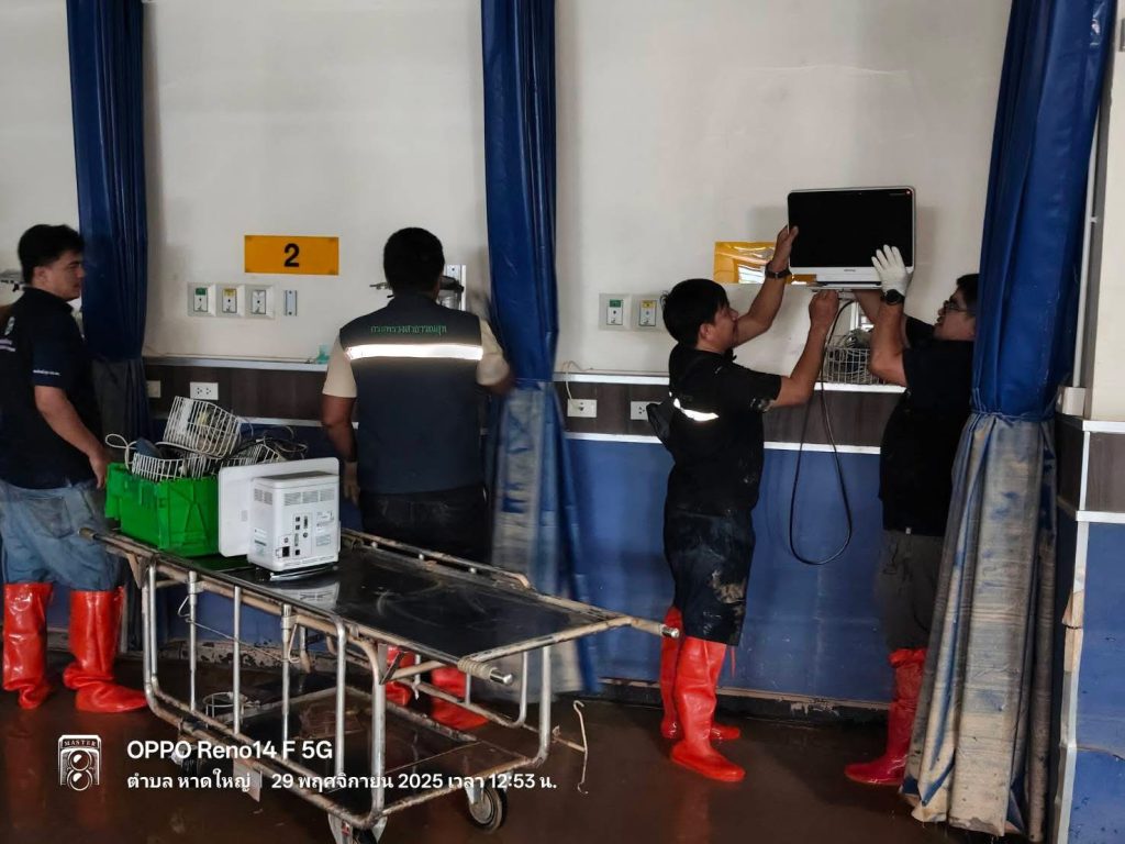 นายแพทย์ภูวเดช สุระโคตร อธิบดีกรม สบส. กล่าวว่า ภายหลังสถานการณ์อุทกภัยในพื้นที่จังหวัดสงขลา เริ่มคลี่คลายลง รัฐมนตรีว่าการกระทรวงสาธารณสุข นายพัฒนา พร้อมพัฒน์ ได้ให้ความสำคัญต่อการให้ความช่วยเหลือพี่น้องประชาชนในพื้นที่ให้สามารถกลับมาใช้ชีวิตได้ตามปกติโดยเร็วที่สุด ซึ่งการจะช่วยเหลือพี่น้องประชาชนในเบื้องต้นนั้นระบบบริการทางการแพทย์เป็นสิ่งที่ขาดไปมิได้ โดยเฉพาะในสถานการณ์ฉุกเฉินเช่นนี้ ที่พี่น้องประชาชนเกิดการเจ็บป่วยจากการประสบเหตุอุกทกภัย บางรายขาดการพบแพทย์ตามกำหนด หรือขาดการรับยาโรคประจำตัว กรม สบส. จึงสั่งการทีม MSERT จากกองวิศวกรรมการแพทย์ กองแบบแผน ศูนย์สนับสนุนบริการสุขภาพที่ 1 – 12 ลงสำรวจพื้นที่ภายหลังน้ำลด ตั้งแต่วันที่ 27 พฤศจิกายน 2568 ที่ผ่านมา โดยมุ่งเน้นความสำคัญในการฟื้นฟูระบบบริการทางการแพทย์ของโรงพยาบาลหาดใหญ่ เริ่มจากการตรวจสอบระบบแสงสว่าง ปลั๊กไฟ ก๊าซทางการแพทย์ เครื่องมือแพทย์ พร้อมติดตั้งระบบไฟฟ้าชั่วคราว และทดสอบระบบไฟฟ้าห้องฉุกเฉินเพื่อเตรียมความพร้อม ณ จุดใช้งานสำคัญของห้องฉุกเฉิน (ER) และแผนกผู้ป่วยนอก (OPD) ทำความสะอาดพื้นที่ ER เคลียร์พื้นที่ OPD และงานเวชกรรม เพื่อเตรียมความพร้อมสำหรับการฟื้นฟูบริการอย่างต่อเนื่อง โดยมีบุคลากรของกองทัพเรือร่วมสนับสนุนการดำเนินงานให้เป็นไปอย่างราบรื่น โดยในวันที่ 4 ธันวาคม 2568 นี้ ห้องฉุกเฉิน ห้องผู้ป่วยนอก และห้องผู้ป่วยวิกฤติ (ICU) ของโรงพยาบาลหาดใหญ่จะสามารถเปิดให้บริการได้ตามปกติ