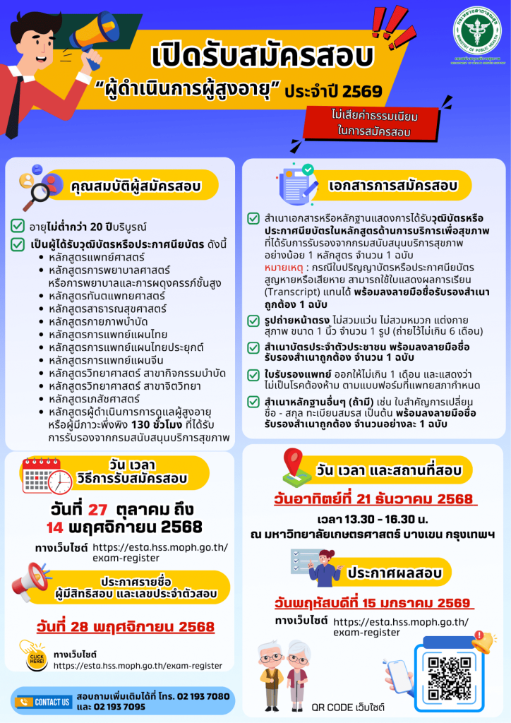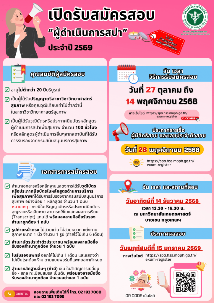 กรมสนับสนุนบริการสุขภาพ เปิดรับสมัครสอบ และประเมินความรู้ความสามารถของผู้ขอรับใบอนุญาตเป็นผู้ดำเนินการในสถานประกอบการเพื่อสุขภาพ ประจำปี 2569