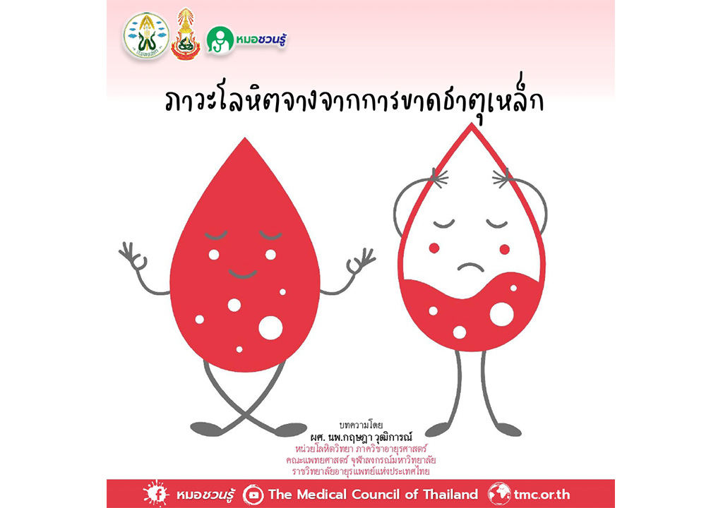 บทความโดยผศ. นพ.กฤษฎา วุฒิการณ์หน่วยโลหิตวิทยา ภาควิชาอายุรศาสตร์คณะแพทยศาสตร์ จุฬาลงกรณ์มหาวิทยาลัยราชวิทยาลัยอายุรแพทย์แห่งประเทศไทย File Download ภาวะโลหิตจางเป็นภาวะที่ร่างกายมีเม็ดเลือดแดงต่ำกว่าระดับปกติ สาเหตุของภาวะโลหิตจางมีหลากหลายสาเหตุ ไม่ว่าจะเป็นจากภาวะการขาดเกลือแร่วิตามิน ความผิดปกติของพันธุกรรมต่าง ๆ ภาวะเม็ดเลือดแดงแตกตัว ไปจนถึงความผิดปกติของไขกระดูก โดยภาวะโลหิตจางที่พบบ่อยที่สุดคือ ภาวะโลหิตจางจากการขาดธาตุเหล็ก ซึ่งพบได้ในทุกช่วงอายุ และก่อให้เกิดปัญหาทางสุขภาพแก่ผู้ป่วย ตลอดจนเป็นภาระทางสาธารณสุข มีการประมาณการว่าประชากรทั่วโลกประมาณ 2 พันล้านคนมีภาวะโลหิตจางจากการขาดธาตุเหล็ก อุบัติการณ์ในการเกิดภาวะโลหิตจางจากการขาดธาตุเหล็กพบมากที่สุดในกลุ่มเด็กอายุน้อยกว่า 5 ปี รองลงมาคือ กลุ่มผู้หญิงวัยรุ่นและวัยเจริญพันธุ์ ภาวะโลหิตจางจากการขาดธาตุเหล็กเกิดจากการที่ร่างกายมีปริมาณธาตุเหล็กสะสมน้อยกว่าเกณฑ์ปกติ ทำให้ร่างกายไม่สามารถสร้างเม็ดเลือดแดงได้เพียงพอ นอกจากนี้เม็ดเลือดแดงที่สร้างขึ้นมามีขนาดรวมถึงรูปร่างที่ผิดปกติไป ส่งผลทำให้เกิดอาการของภาวะโลหิตจางจากความบกพร่องของการทำงานของอวัยวะ เช่น อาการอ่อนเพลีย วิงเวียนศีรษะ อาการเหนื่อย หรือเป็นลมหมดสติ ไปจนถึงหัวใจล้มเหลวได้ในกรณีที่ภาวะโลหิตจางรุนแรง สาเหตุของภาวะโลหิตจางจากการขาดธาตุเหล็กนั้นเกิดจากการที่ร่างกายมีภาวะขาดดุลธาตุเหล็ก ทำให้ปริมาณเหล็กสะสมในร่างกายพร่องลงจนมีระดับต่ำในที่สุดโดยภาวะขาดดุลเหล็กนั้นมีหลายสาเหตุพบได้ทั้งในภาวะปกติและภาวะผิดปกติ โดยมีกลไกหลัก 3 กลไก ได้แก่ การสูญเสียเหล็กจากการเสียเลือด โดยเฉพาะการเสียเลือดเรื้อรัง ความต้องการธาตุเหล็กของร่างกายที่เพิ่มสูงขึ้นกว่าปกติ ความผิดปกติในการดูดซึมธาตุเหล็กของทางเดินอาหาร ทั้งนี้กลไกของการขาดธาตุเหล็กที่สำคัญที่สุดอันนำไปสู่ ภาวะโลหิตจางจากการขาดธาตุเหล็กในผู้ใหญ่ คือ การสูญเสียเหล็กจากการเสียเลือดเรื้อรัง โดยการเสียเลือดทำให้มีการสูญเสียธาตุเหล็กจากเม็ดเลือดแดงไป ทำให้มีสมดุลธาตุเหล็กเป็นลบ จากการที่มีปริมาณธาตุเหล็กที่เสียไปจากร่างกายมากกว่าปริมาณธาตุเหล็กที่ร่างกายได้รับเพิ่มจากอาหารในแต่ละวัน เมื่อมีการเสียเลือดเป็นเวลานานทำให้มีภาวะพร่องธาตุเหล็กในที่สุด โดย ภาวะโลหิตจางจากการธาตุเหล็กที่เกิดจากการเสียเลือดเรื้อรัง พบมากในสตรีวัยเจริญพันธุ์ผ่านการเสียเลือดประจำเดือน โดยเฉพาะใน
