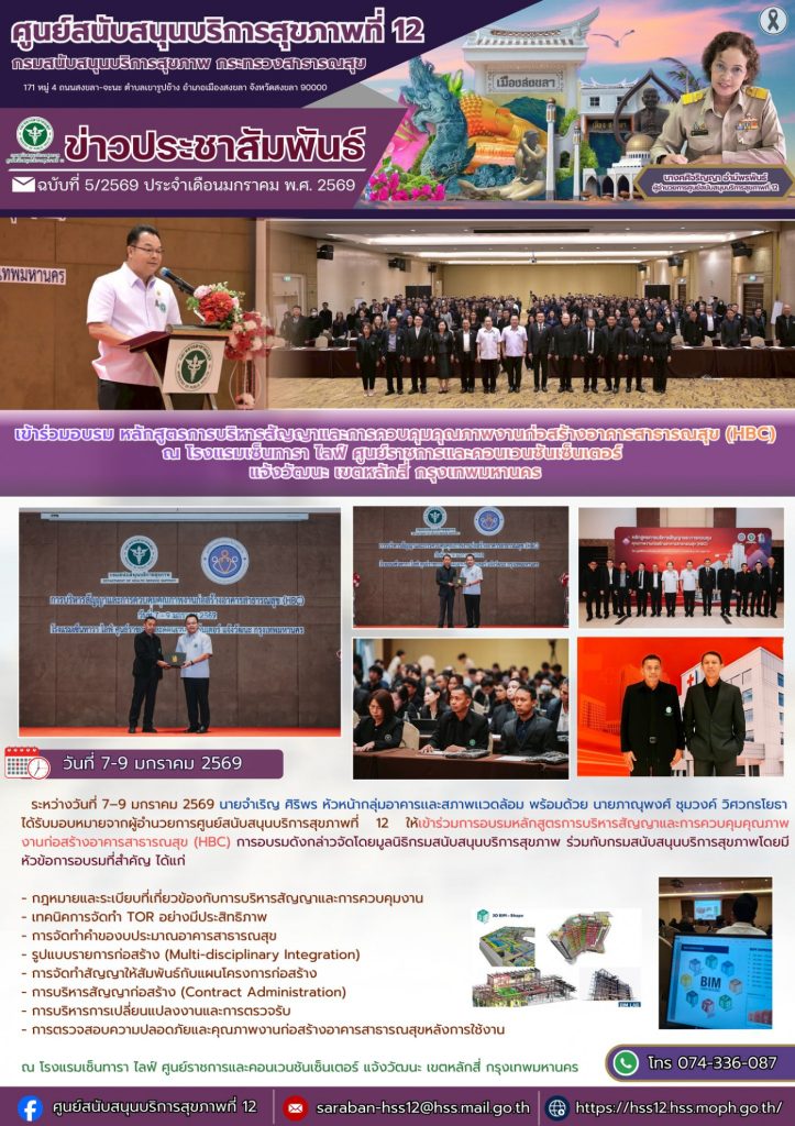เข้าร่วมอบรมหลักสูตรการบริหารสัญญาและการควบคุมคุณภาพงานก่อสร้างอาคารสาธารณสุข (HBC)ณ โรงแรมเซ็นทารา ไลฟ์ ศูนย์ราชการและคอนเวนชันเซ็นเตอร์ แจ้งวัฒนะ เขตหลักสี่ กรุงเทพมหานคร ระหว่างวันที่ 7–9 มกราคม 2569 นายจำเริญ ศิริพร หัวหน้ากลุ่มอาคารเเละสภาพเเวดล้อม พร้อมด้วย นายภาณุพงศ์ ชุมวงค์ วิศวกรโยธาได้รับมอบหมายจากผู้อำนวยการศูนย์สนับสนุนบริการสุขภาพที่ 12 ให้เข้าร่วมการอบรมหลักสูตรการบริหารสัญญาและการควบคุมคุณภาพ งานก่อสร้างอาคารสาธารณสุข (HBC) การอบรมดังกล่าวจัดโดยมูลนิธิกรมสนับสนุนบริการสุขภาพ ร่วมกับกรมสนับสนุนบริการสุขภาพโดยมีหัวข้อการอบรมที่สำคัญ ได้แก่- กฎหมายและระเบียบที่เกี่ยวข้องกับการบริหารสัญญาและการควบคุมงาน- เทคนิคการจัดทำ TOR อย่างมีประสิทธิภาพ- การจัดทำคำของบประมาณอาคารสาธารณสุข- รูปแบบรายการก่อสร้าง (Multi-disciplinary Integration)- การจัดทำสัญญาให้สัมพันธ์กับแผนโครงการก่อสร้าง- การบริหารสัญญาก่อสร้าง (Contract Administration)- การบริหารการเปลี่ยนแปลงงานและการตรวจรับ- การตรวจสอบความปลอดภัยและคุณภาพงานก่อสร้างอาคารสาธารณสุขหลังการใช้งานณ โรงแรมเซ็นทารา ไลฟ์ ศูนย์ราชการและคอนเวนชันเซ็นเตอร์ แจ้งวัฒนะ เขตหลักสี่ กรุงเทพมหานคร Facebook Twitter LinkedIn