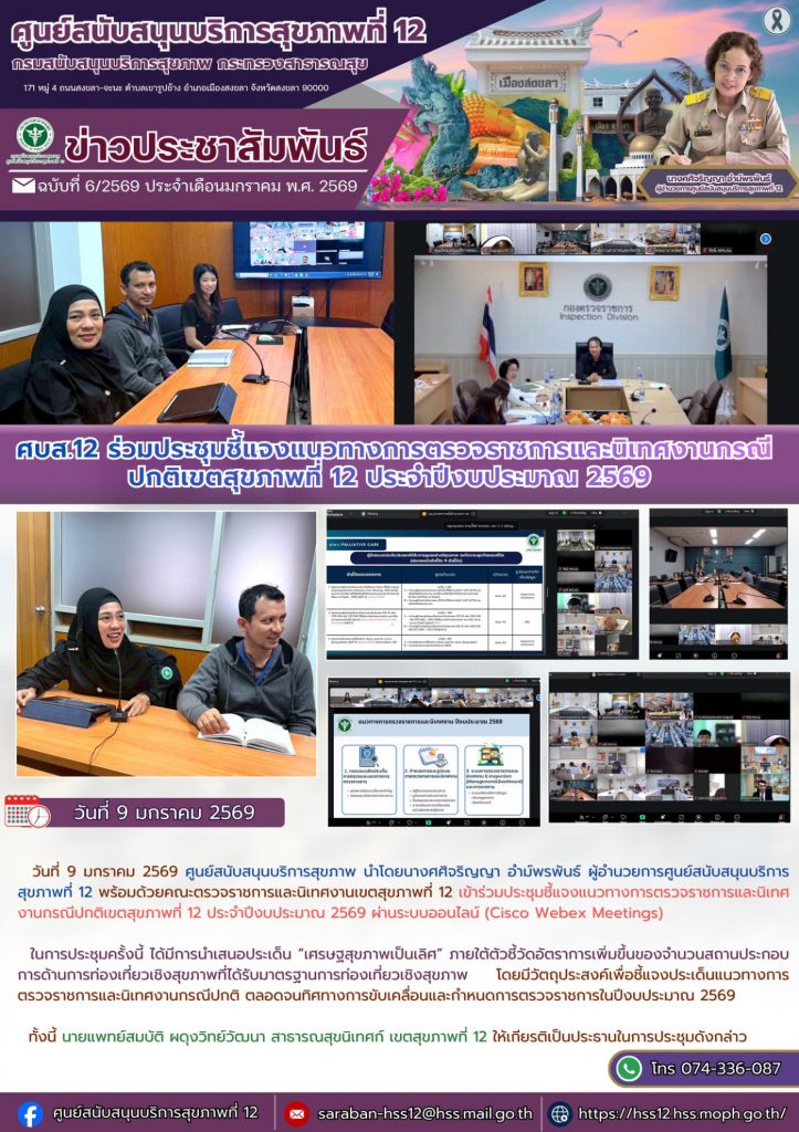 ศบส.12 ร่วมประชุมชี้แจงแนวทางการตรวจราชการและนิเทศงานกรณีปกติเขตสุขภาพที่ 12 ประจำปีงบประมาณ 2569 วันที่ 9 มกราคม 2569 ศูนย์สนับสนุนบริการสุขภาพ นำโดยนางศศิจริญญา อำม์พรพันธ์ ผู้อำนวยการศูนย์สนับสนุนบริการสุขภาพที่ 12 พร้อมด้วยคณะตรวจราชการและนิเทศงานเขตสุขภาพที่ 12 เข้าร่วมประชุมชี้แจงแนวทางการตรวจราชการและนิเทศงานกรณีปกติเขตสุขภาพที่ 12 ประจำปีงบประมาณ 2569 ผ่านระบบออนไลน์ (Cisco Webex Meetings) ในการประชุมครั้งนี้ ได้มีการนำเสนอประเด็น “เศรษฐสุขภาพเป็นเลิศ” ภายใต้ตัวชี้วัดอัตราการเพิ่มขึ้นของจำนวนสถานประกอบการด้านการท่องเที่ยวเชิงสุขภาพที่ได้รับมาตรฐานการท่องเที่ยวเชิงสุขภาพ โดยมีวัตถุประสงค์เพื่อชี้แจงประเด็นแนวทางการตรวจราชการและนิเทศงานกรณีปกติ ตลอดจนทิศทางการขับเคลื่อนและกำหนดการตรวจราชการในปีงบประมาณ 2569ทั้งนี้ นายแพทย์สมบัติ ผดุงวิทย์วัฒนา สาธารณสุขนิเทศก์ เขตสุขภาพที่ 12 ให้เกียรติเป็นประธานในการประชุมดังกล่าว Facebook Twitter LinkedIn