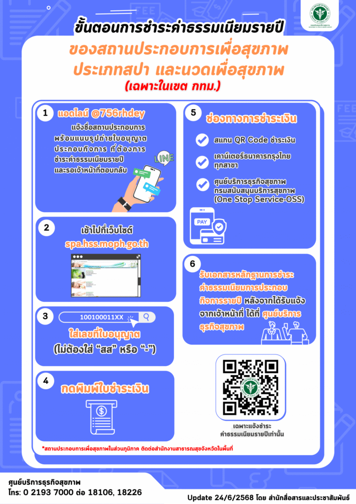 ขั้นตอนการชำระค่าธรรมเนียมรายปีของสถานประกอบการเพื่อสุขภาพ ประเภทสปา และนวดเพื่อสุขภาพ (เฉพาะในเขต กทม.)